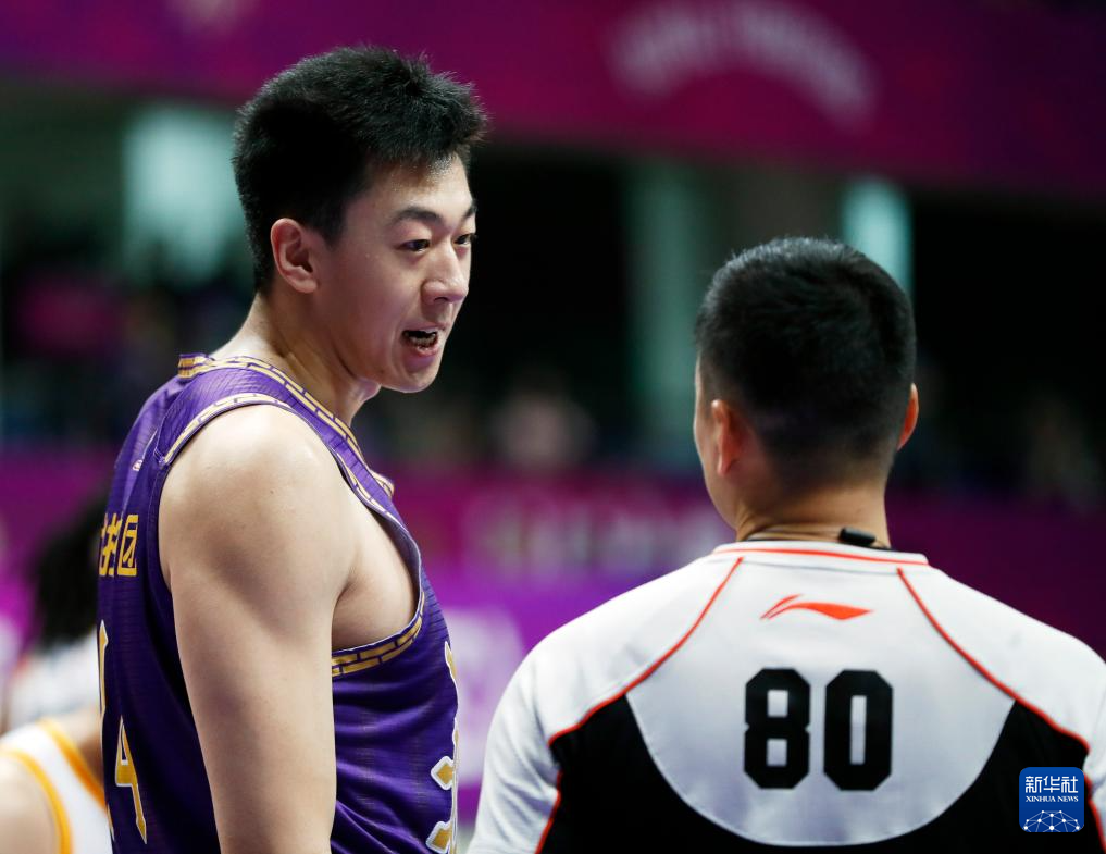 4月13日,北京控股队球员王少杰(左)在比赛中和裁判沟通。新华社记者 雒圆 摄