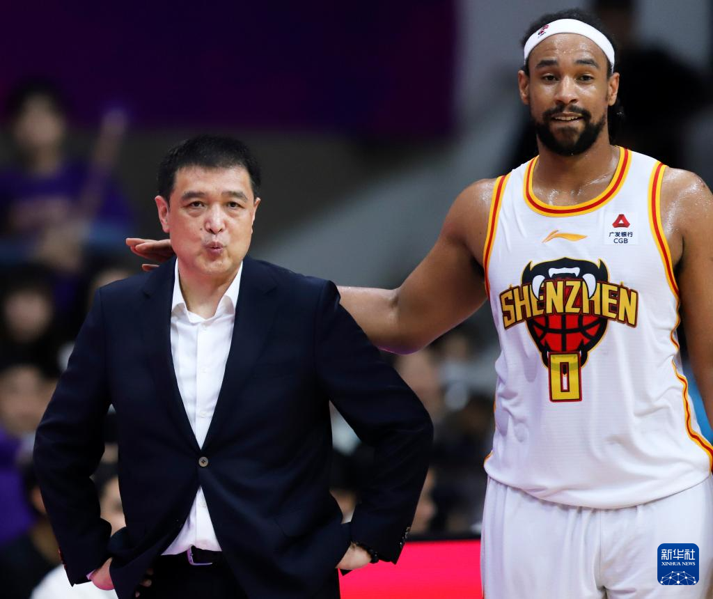 4月13日,北京控股队主教练闵鹿蕾(左)与深圳马可波罗队球员萨林杰在场边。新华社记者 雒圆 摄