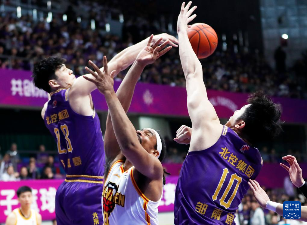4月13日,北京控股队球员陈国豪(左)和邹雨宸(右)防守深圳马可波罗队球员萨林杰。新华社记者 雒圆 摄