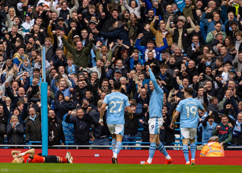 胜利几无悬念,瓜迪奥拉终于放心将哈兰德和德布劳内换下。虽然客队随即就由巴克利扳回一城,但本场表现突出的多库第87分钟连续过人后推射远角破门,后卫格瓦迪奥又在终场补时阶段劲射命中,将比分锁定在5:1。