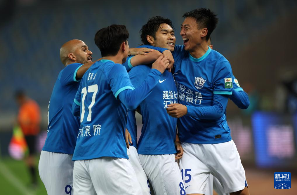 4月14日,青岛西海岸队球员在比赛中庆祝进球。新华社发(周洋摄)