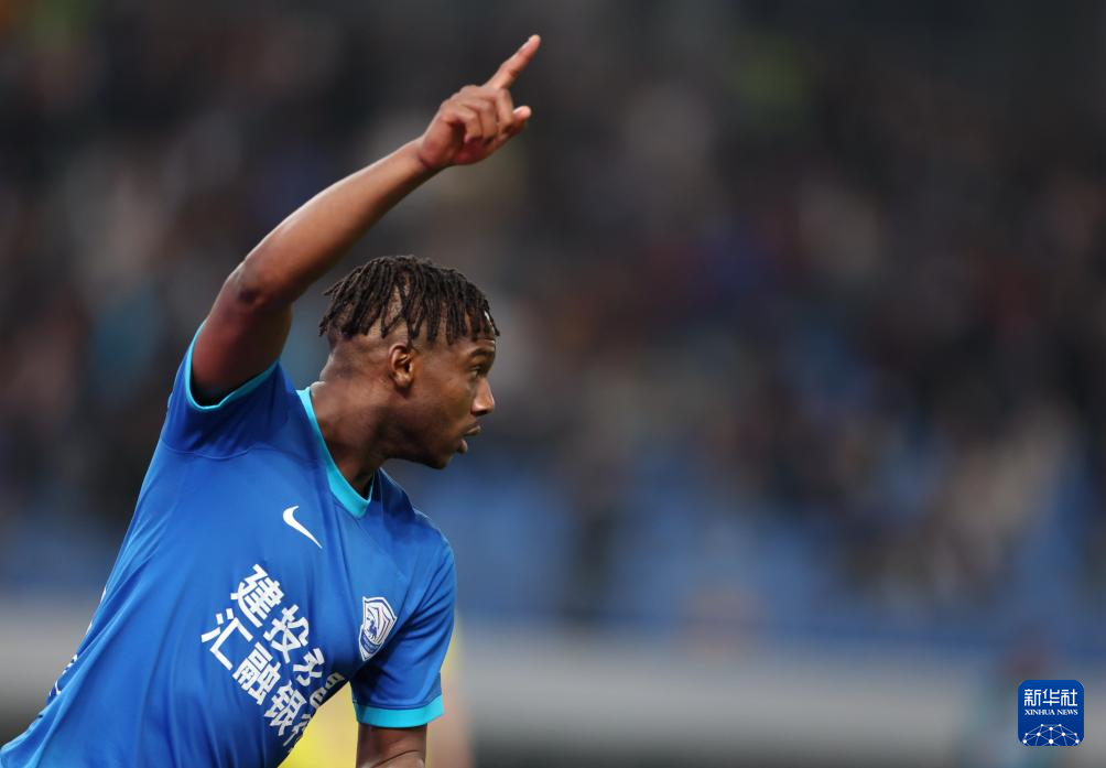 4月14日,沧州雄狮队球员所罗门·奥塔博尔在比赛中庆祝进球。新华社发(周洋摄)