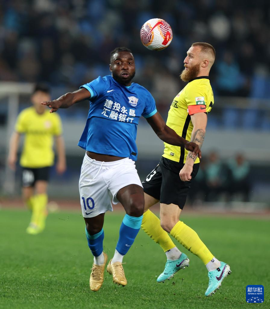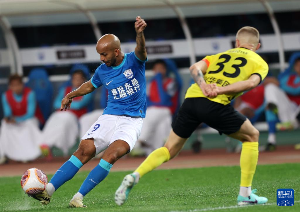 4月14日,沧州雄狮队球员埃韦尔(左)在比赛中射门。新华社发(周洋摄)