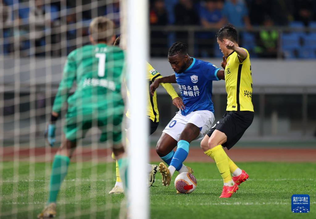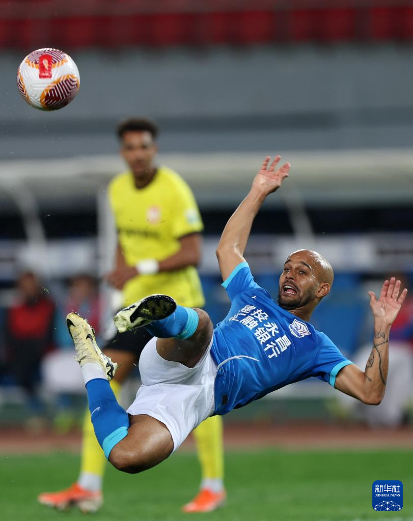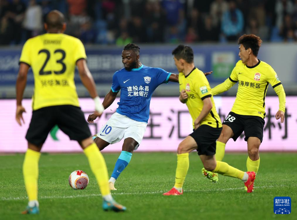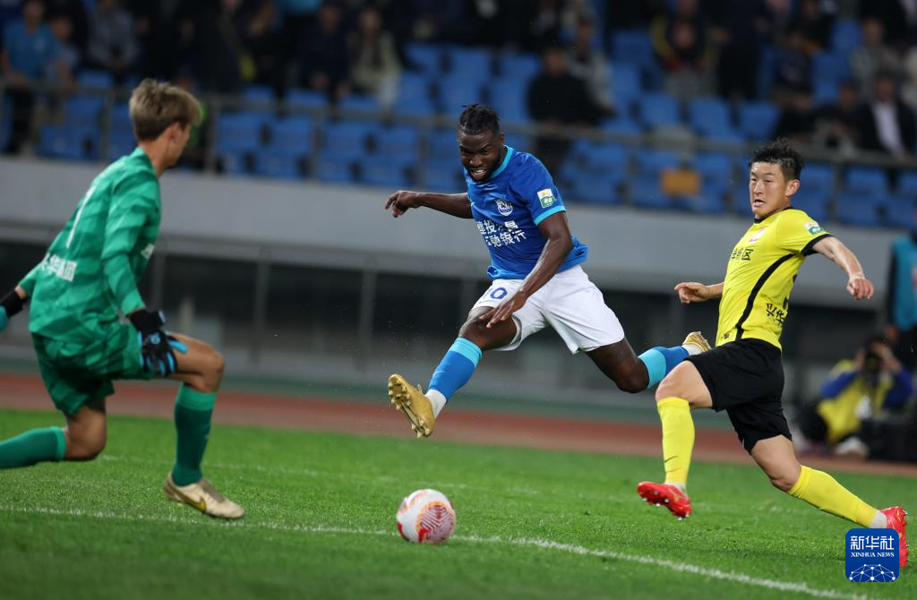 4月14日,沧州雄狮队球员埃韦尔在比赛中射门。新华社发(周洋摄)
