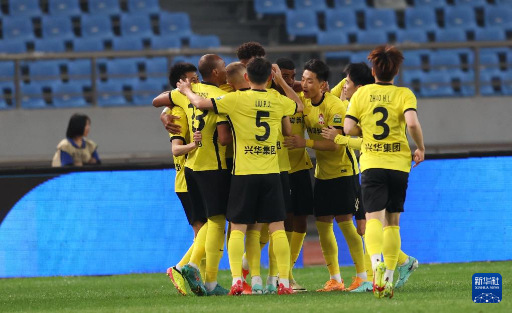 4月14日,沧州雄狮队球员在比赛中庆祝进球。新华社发(周洋摄)
