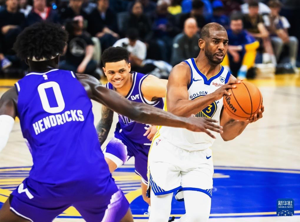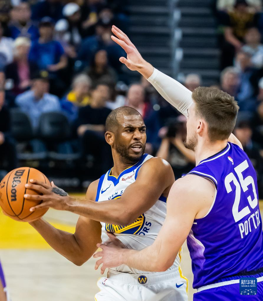 4月14日,勇士队球员保罗(上)在比赛中进攻。新华社发(董旭东摄)