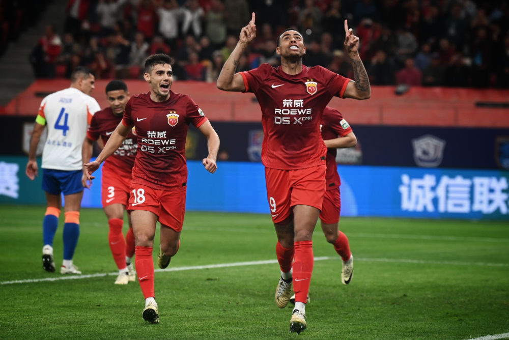 4月14日,上海海港队球员古斯塔沃(前右)在比赛中进球后庆祝。新华社发