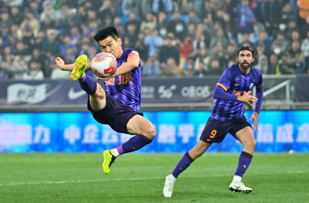 4月14日,天津津门虎队球员王秋明(左)在禁区内凌空射门。新华社记者 孙凡越 摄