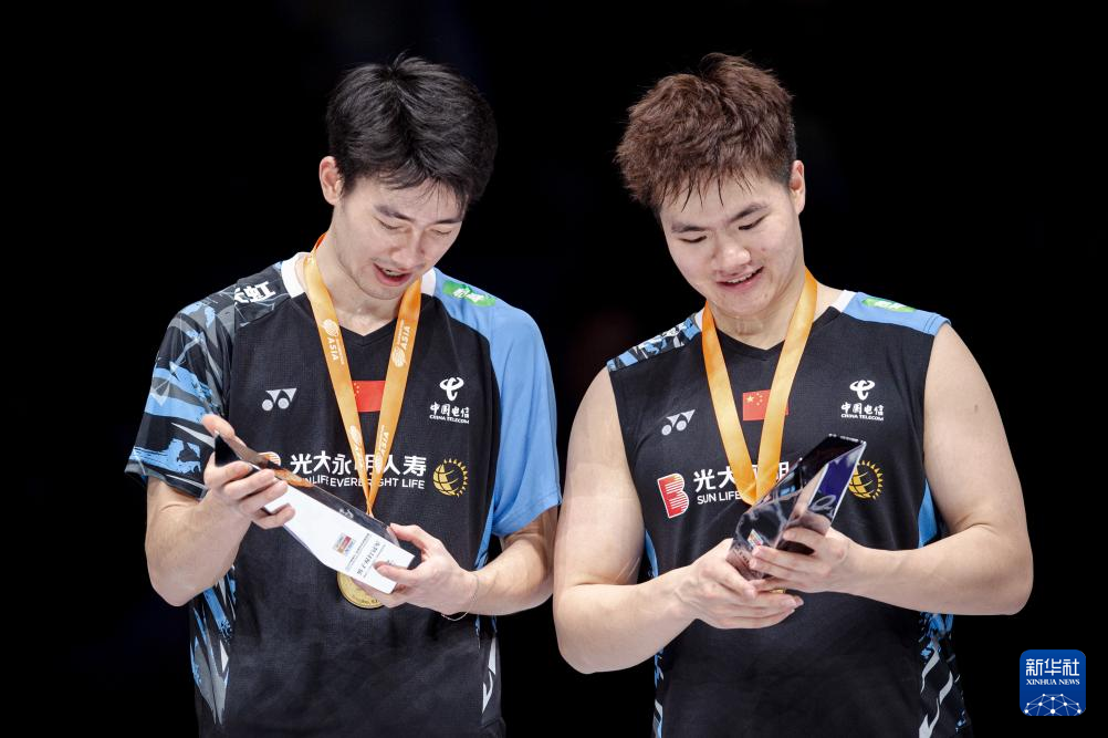 4月14日,梁伟铿(右)/王昶在颁奖仪式上。新华社记者 江汉 摄