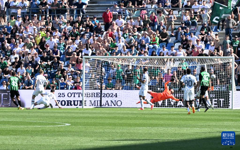 4月14日,萨索洛队球员劳里恩特(左一)在比赛中射门得分。新华社发(阿尔贝托·林格利亚摄)