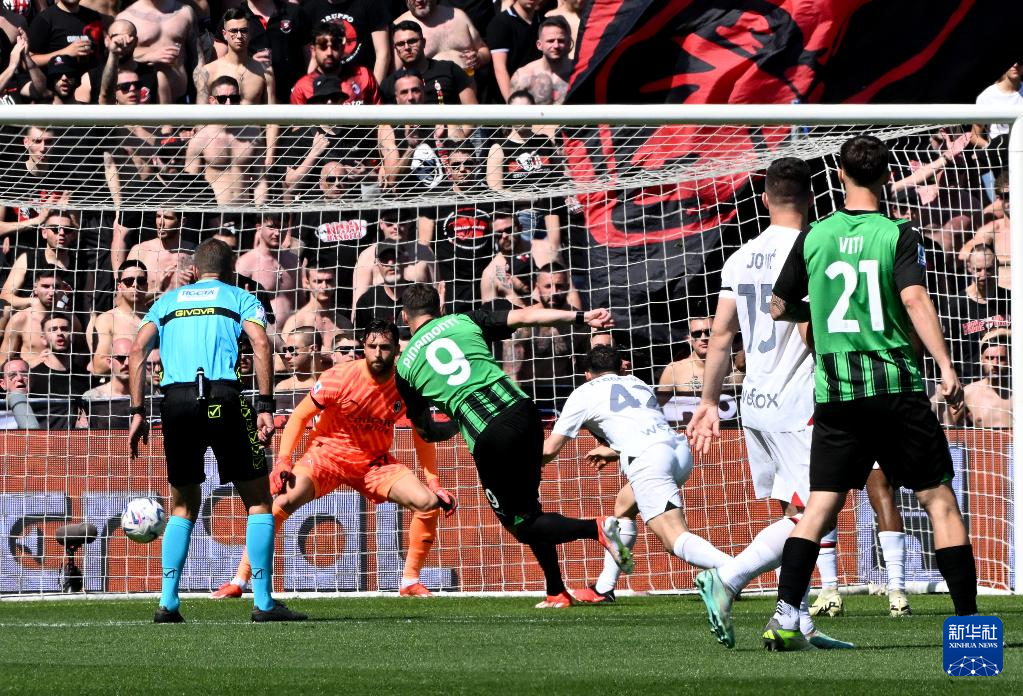 4月14日,萨索洛队球员皮纳蒙蒂(左三)在比赛中射门得分。新华社发(阿尔贝托·林格利亚摄)