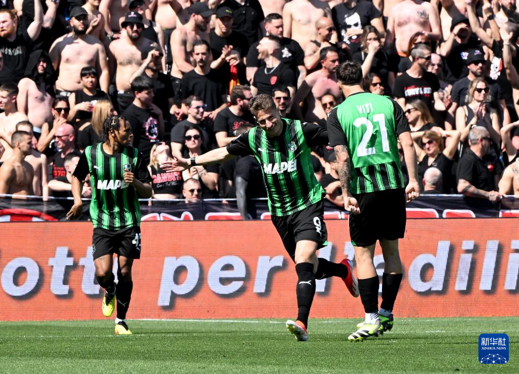 4月14日,萨索洛队球员皮纳蒙蒂(中)在比赛中庆祝进球。新华社发(阿尔贝托·林格利亚摄)