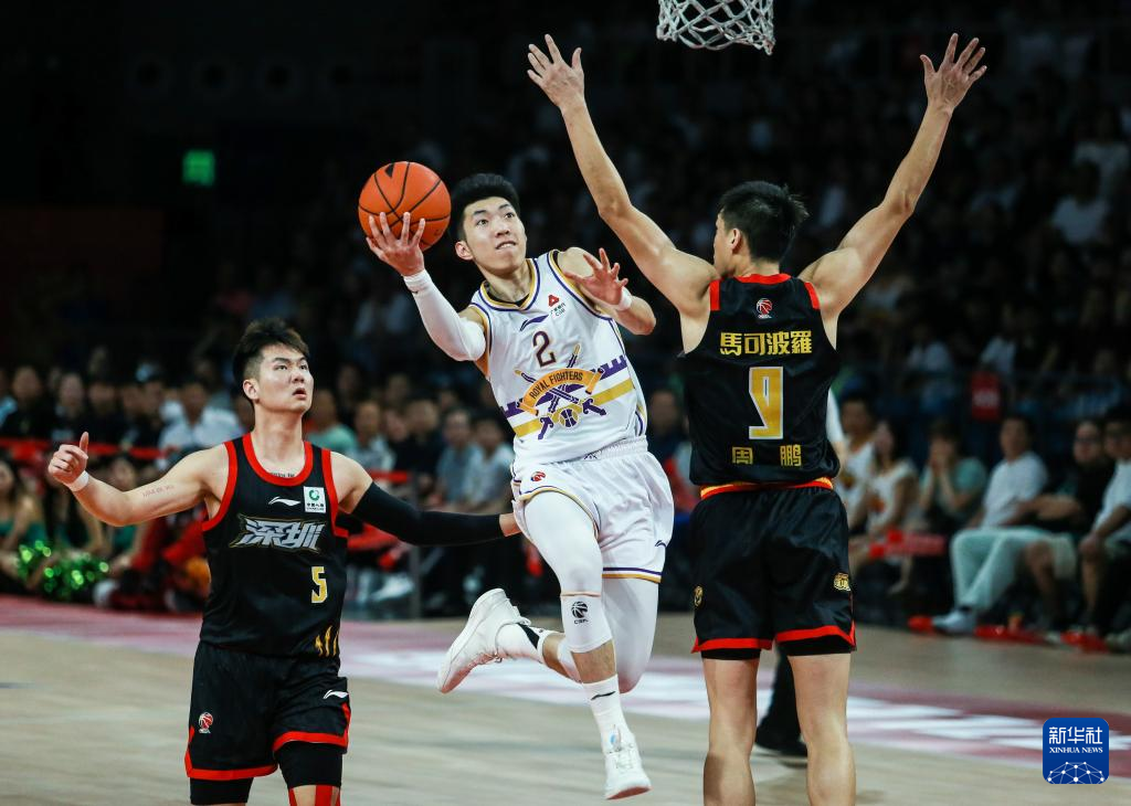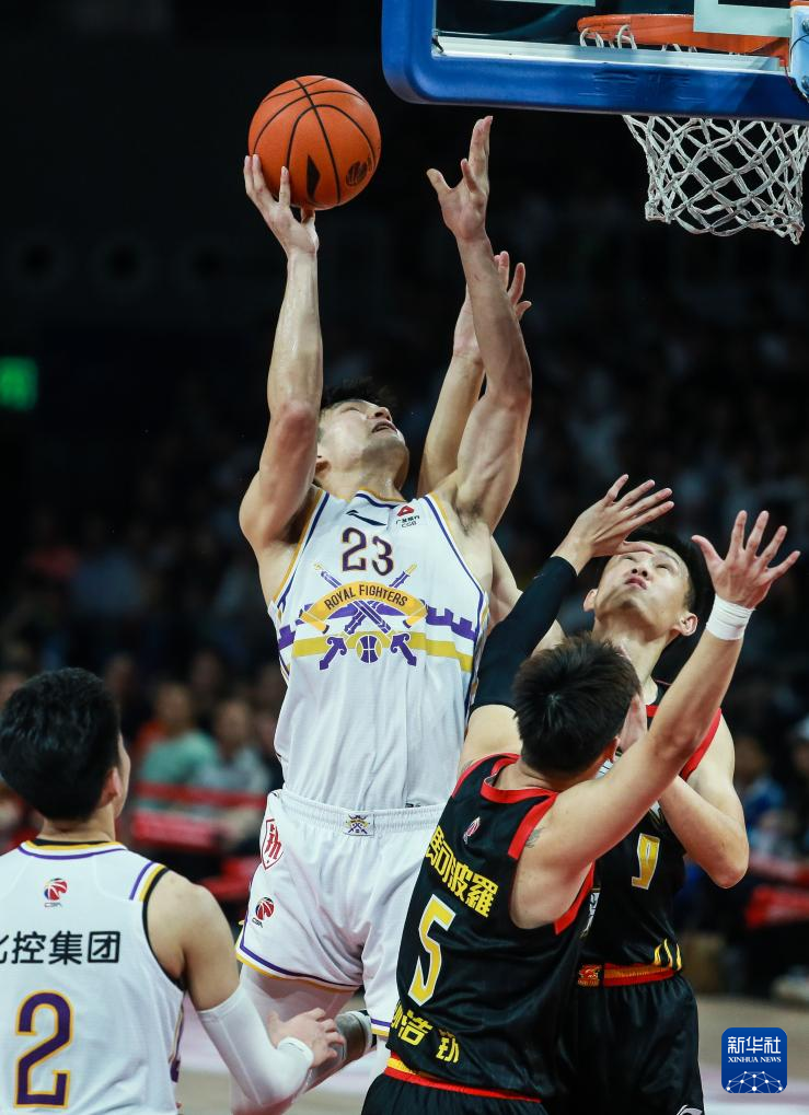 4月15日,北京控股队球员廖三宁(中)在比赛中上篮。新华社发(彭志刚摄)