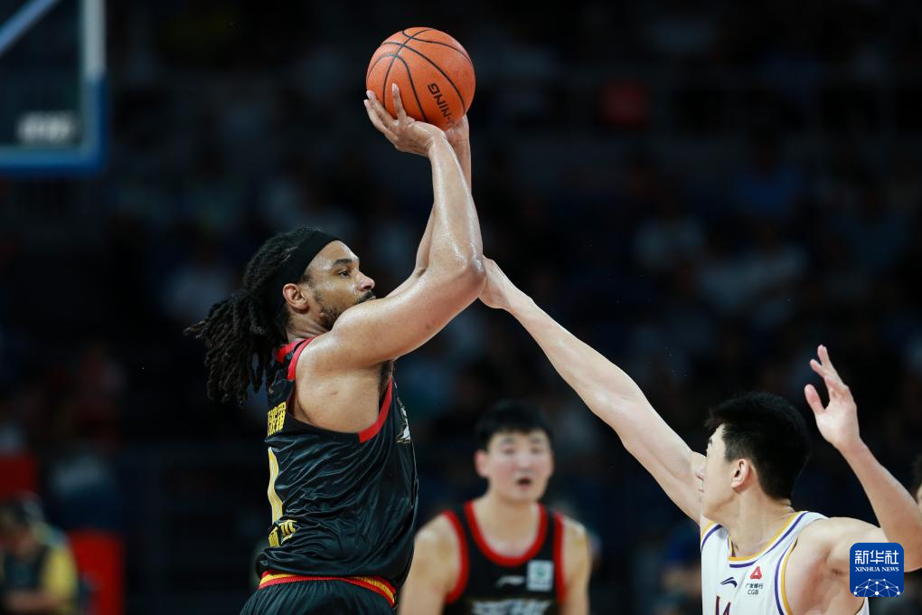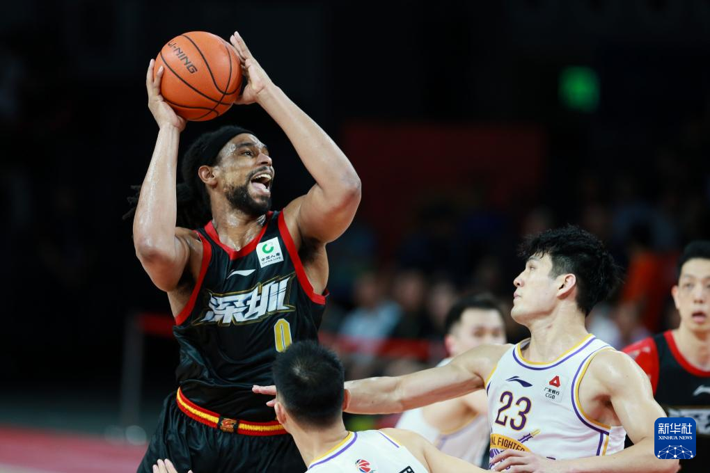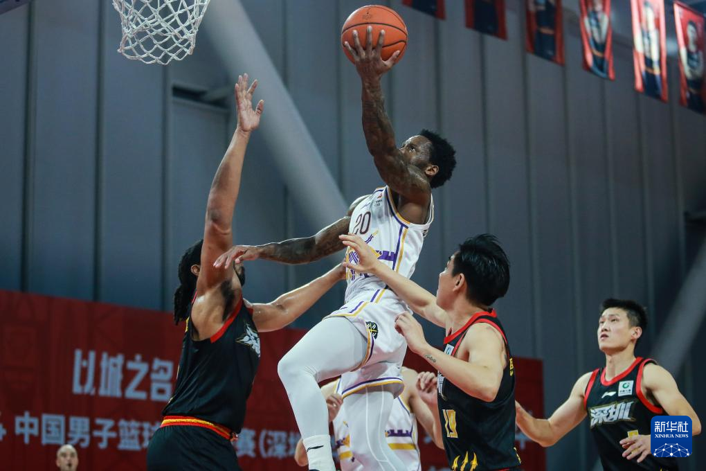 4月15日,深圳马可波罗队球萨林杰(左)在比赛中投篮。新华社发(彭志刚摄)