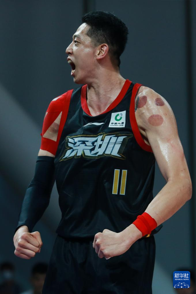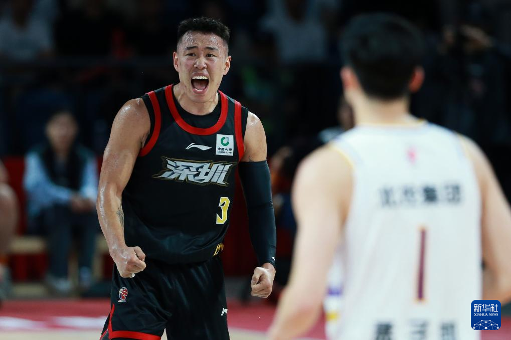 4月15日,深圳马可波罗队球员萨林杰在比赛中庆祝。新华社发(彭志刚摄)