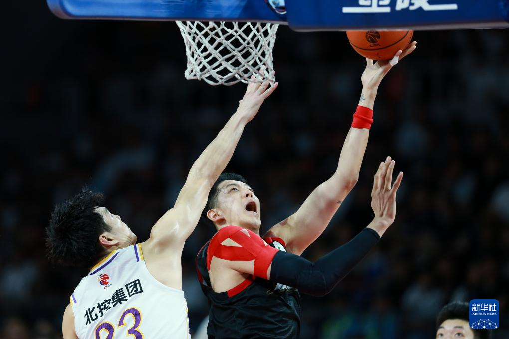 4月15日,北京控股队球员陈国豪(上)在比赛中上篮。新华社发(彭志刚摄)