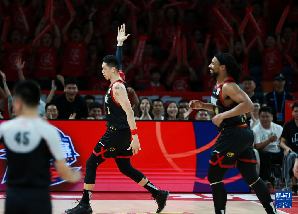 4月15日,深圳马可波罗队球员贺希宁(左)在比赛中庆祝。新华社发(彭志刚摄)