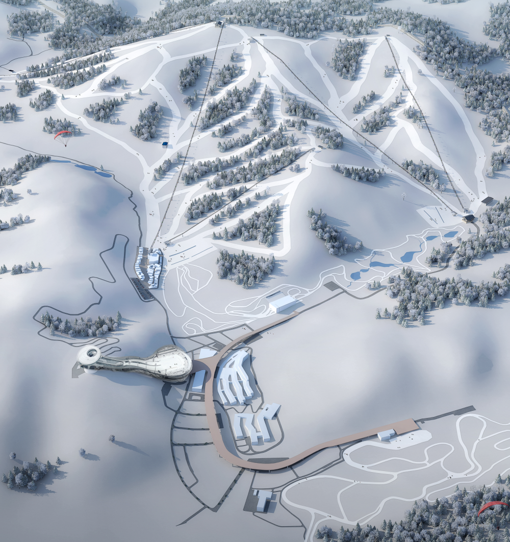 雪如意滑雪场位于张家口崇礼奥林匹克公园内,邻近北京冬奥会标志性场馆国家跳台滑雪中心“雪如意”以及国家冬季两项中心、国家越野滑雪中心。规划雪道总面积140公顷,滑雪道总长度31827米,设置高山雪道32条,设置高速缆车5条,其中箱式缆车3条,吊椅缆车2条,有的缆车可以直接进入滑雪大厅二层。