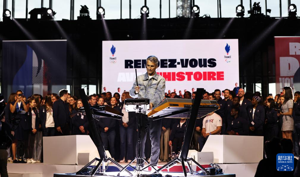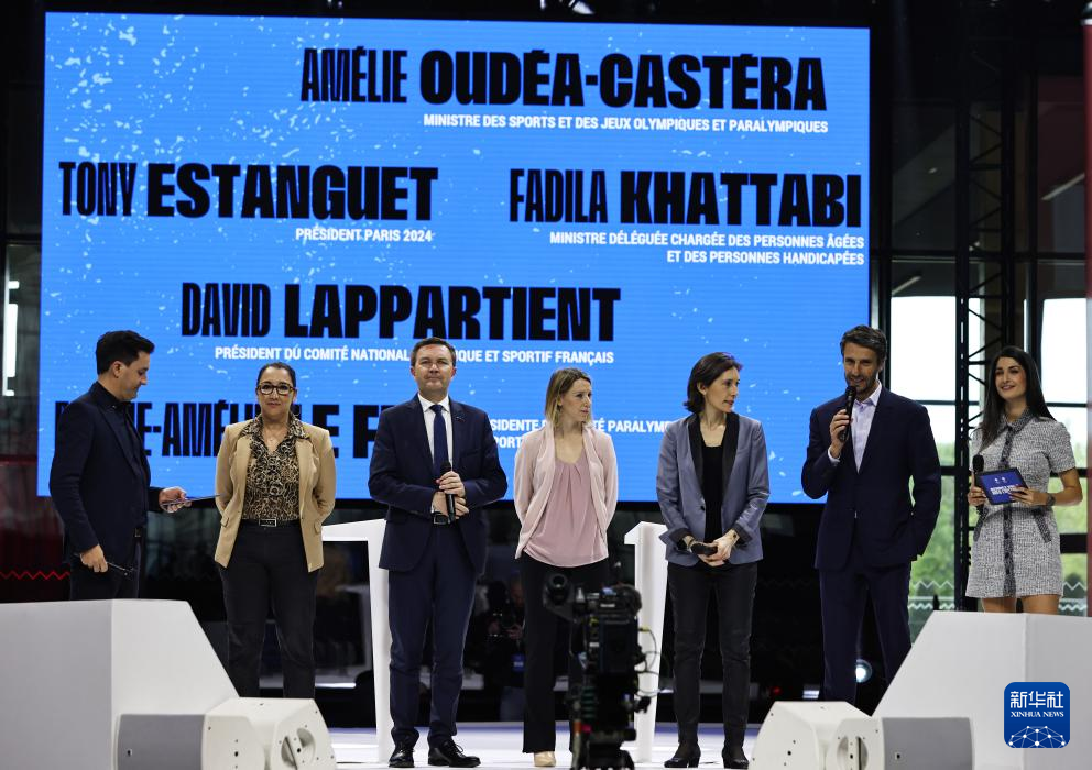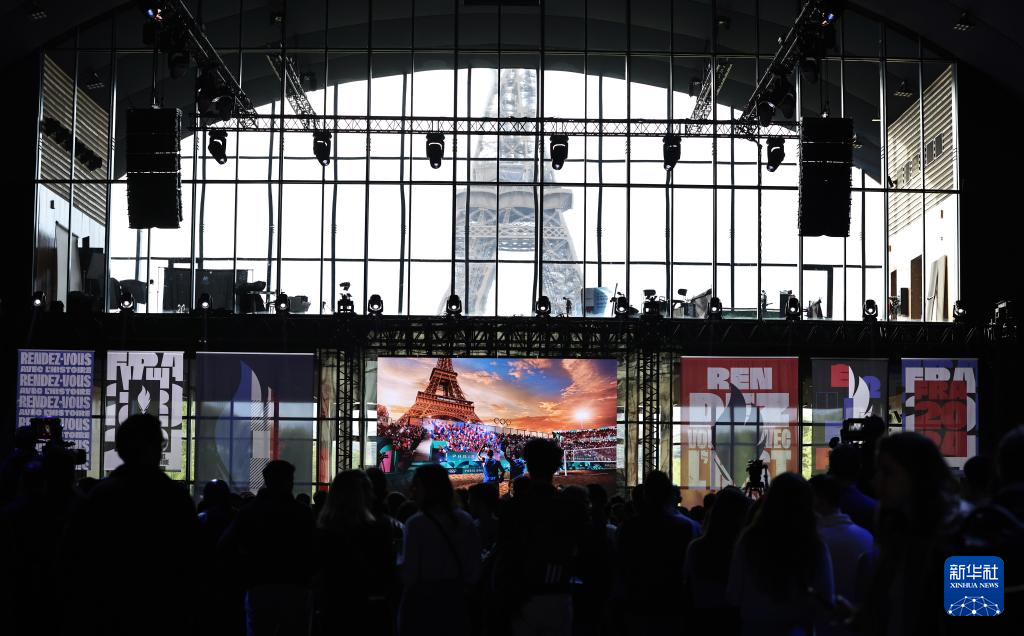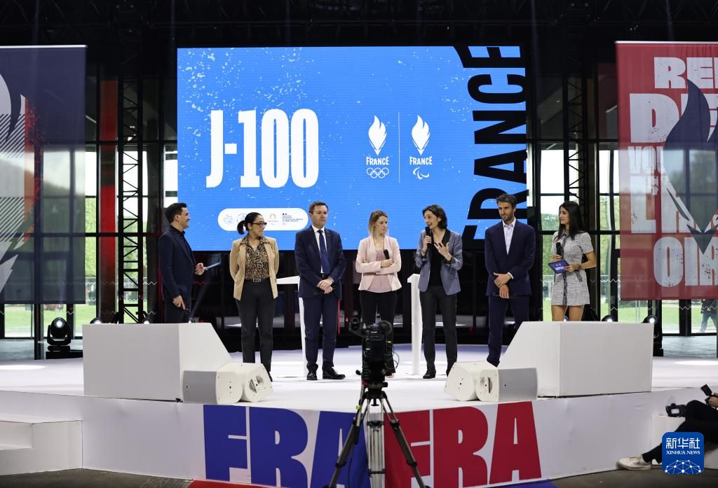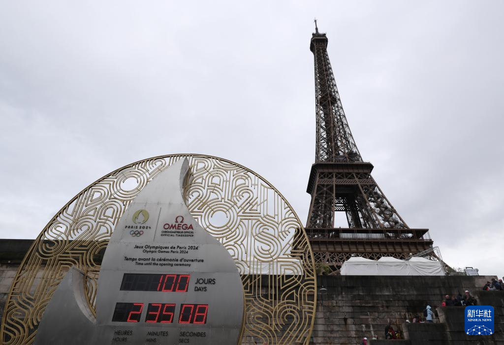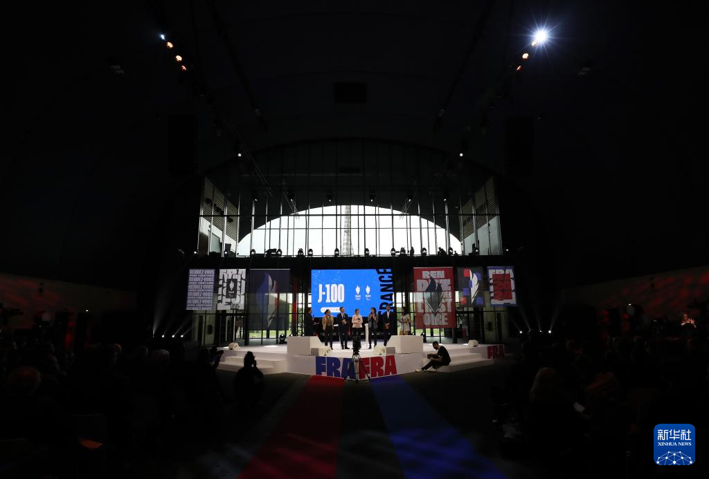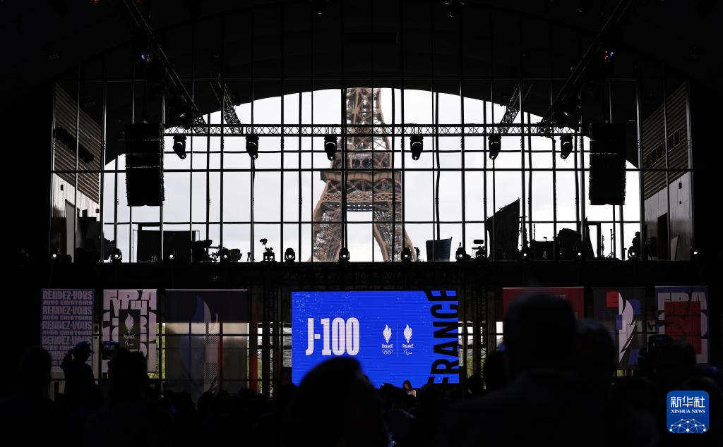 当日,巴黎奥运会倒计时100天庆祝活动在法国巴黎埃菲尔铁塔附近的临时大皇宫举行。