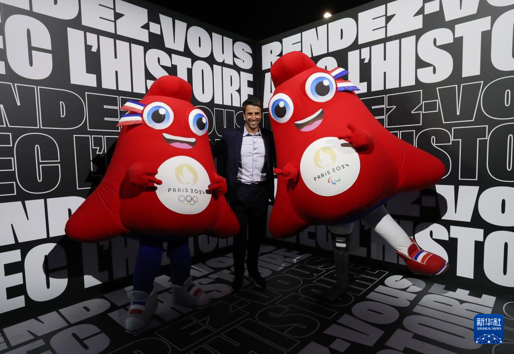 4月17日,巴黎奥组委主席托尼·埃斯坦盖在庆祝活动中与巴黎奥运会和残奥会吉祥物合影留念。新华社记者 高静 摄