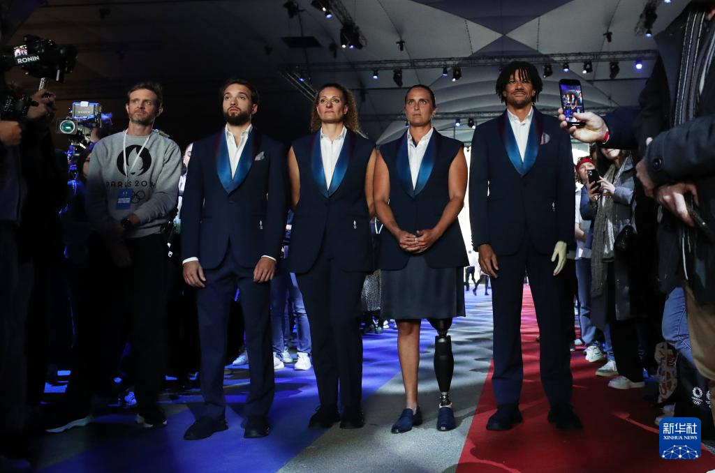 4月17日,法国运动员在庆祝活动上展示法国队奥运会开幕式服装。新华社记者 高静 摄