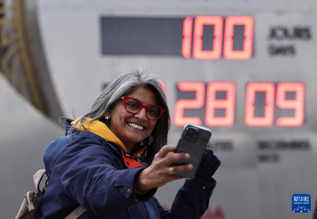 4月17日,一位女士在法国巴黎埃菲尔铁塔脚下与巴黎奥运会倒计时牌合影留念。新华社记者 高静 摄