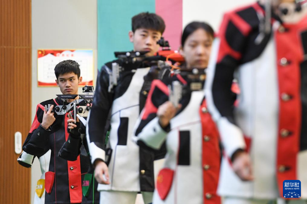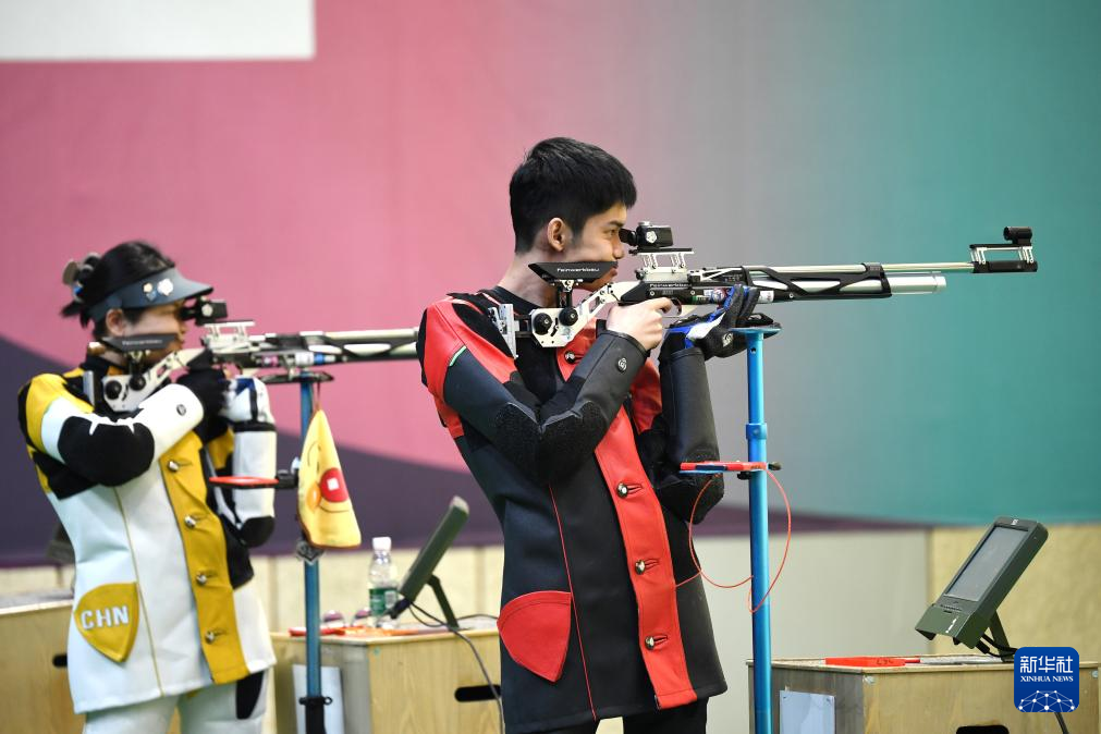 4月18日,盛李豪(左一)在10米气步枪个人训练赛决赛中。新华社记者 鞠焕宗 摄