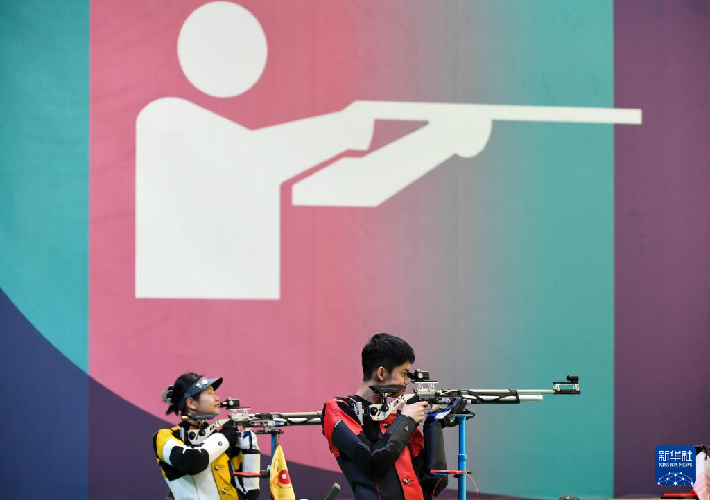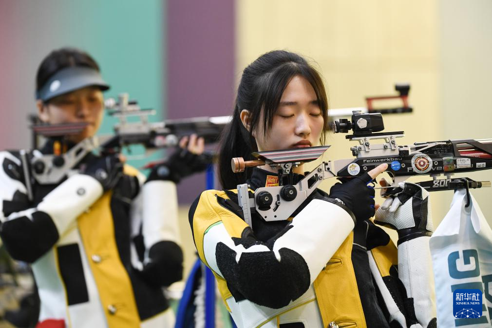 4月18日,范馨仡(左)在10米气步枪个人训练赛决赛中。新华社记者 鞠焕宗 摄