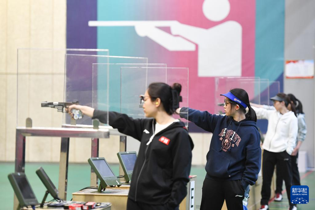 4月18日,赵楠(前)在女子25米手枪训练赛决赛中。新华社记者 鞠焕宗 摄