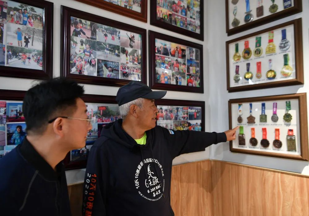 2023年4月1日,厦门跑友圈人称“厦门老高”的高振海(右)在向顾客展示他的参赛奖牌。他在女儿新开的小水饺店里布置一番,把252块奖牌和马拉松参赛照片整整齐齐装框挂墙,开办了自己的“小型个人马拉松展览馆”。新华社记者 魏培全 摄