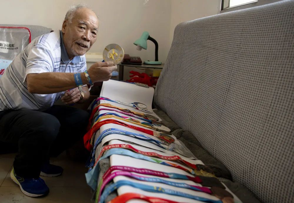 2024年1月5日,88岁的跑者郑承端展示他历年来获得的厦门马拉松赛完赛奖牌。新华社记者 魏培全 摄