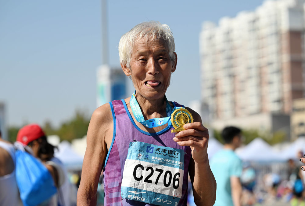 2023年10月15日,72岁的刘润龙在2023天津马拉松完赛后展示完赛奖牌。新华社记者 赵子硕 摄