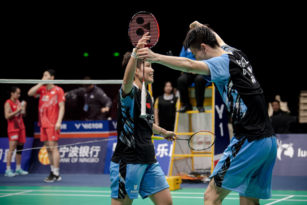 4月14日,冯彦哲(右)/黄东萍在2024亚洲羽毛球锦标赛混合双打决赛中夺冠后庆祝。新华社记者 江汉 摄