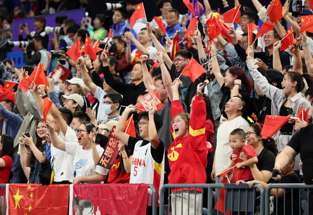 2023年10月5日,在杭州亚运会篮球项目女子决赛中,观众在看台上为中国队加油助威。新华社记者 兰红光 摄