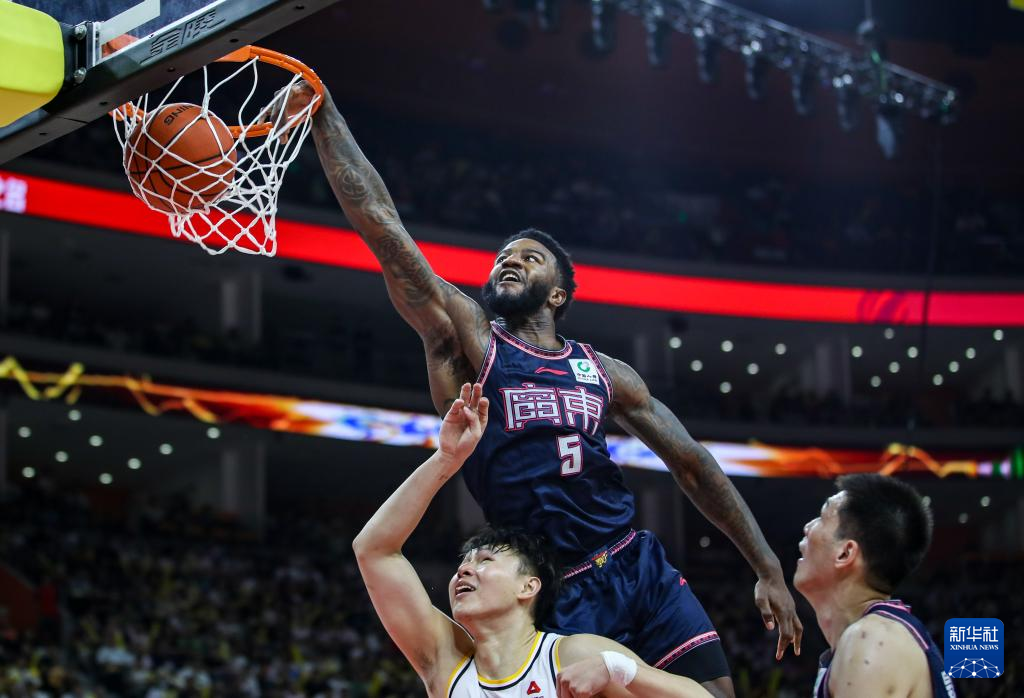 4月18日,广东华南虎队球员贝尔(上)在比赛中扣篮。新华社发(郑家雄摄)