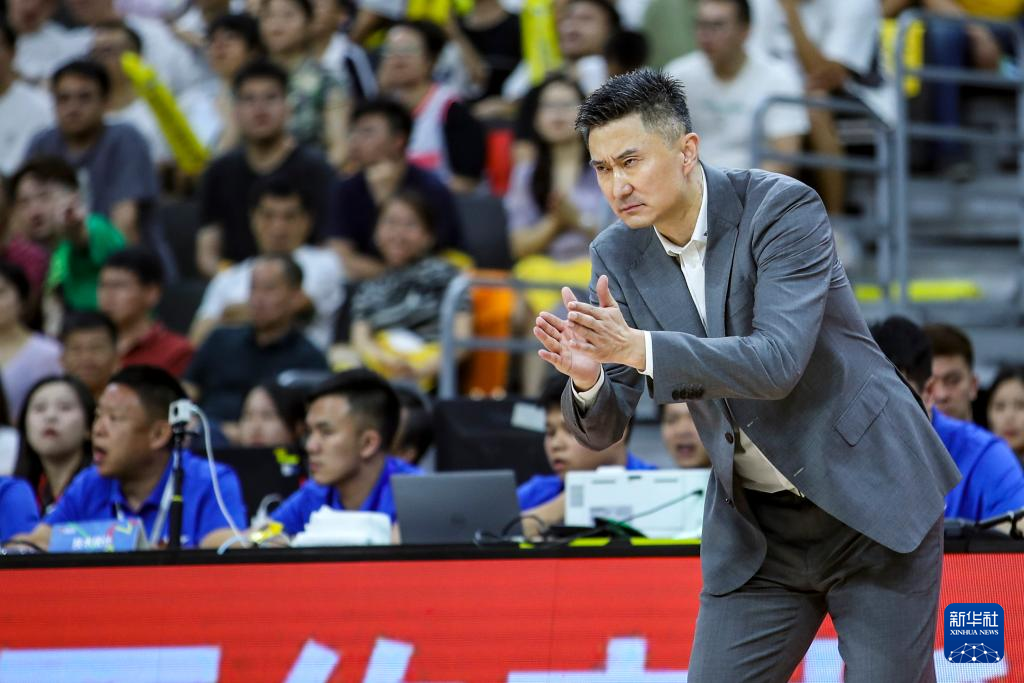 4月18日,广东华南虎队主教练杜锋在比赛中鼓励队员。新华社发(郑家雄摄)