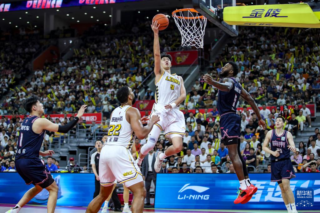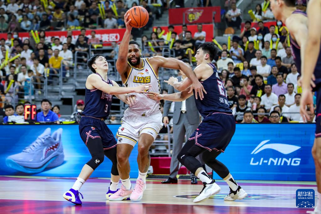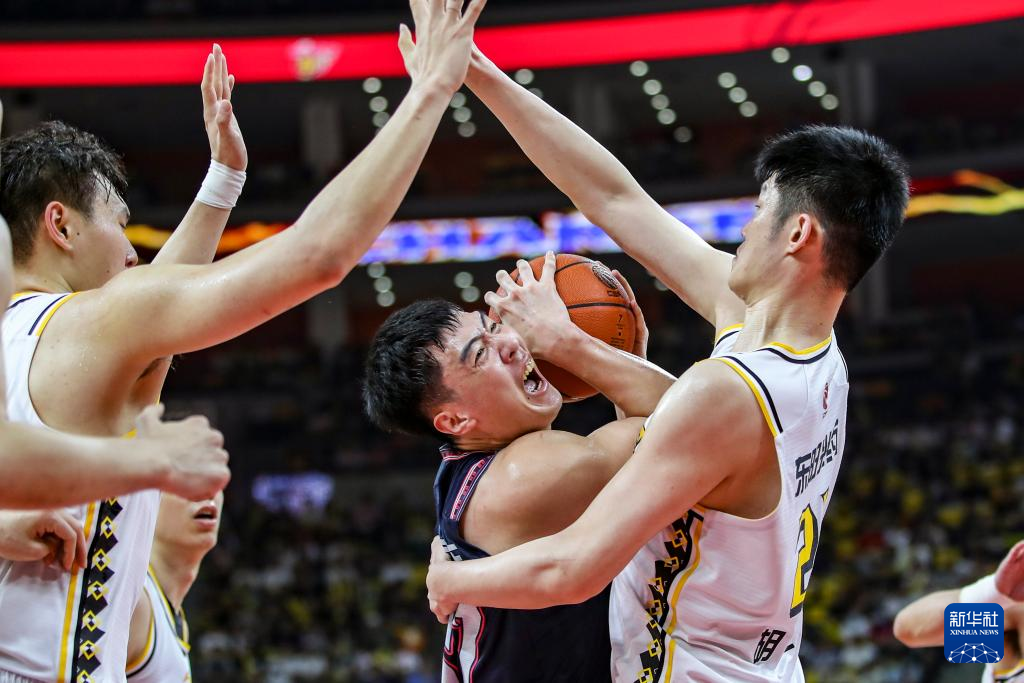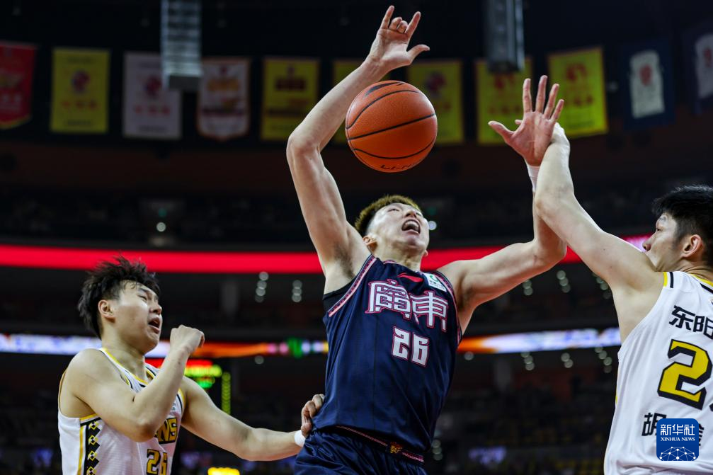 4月18日,广东华南虎队周琦(中)在比赛中上篮受阻。新华社发(郑家雄摄)