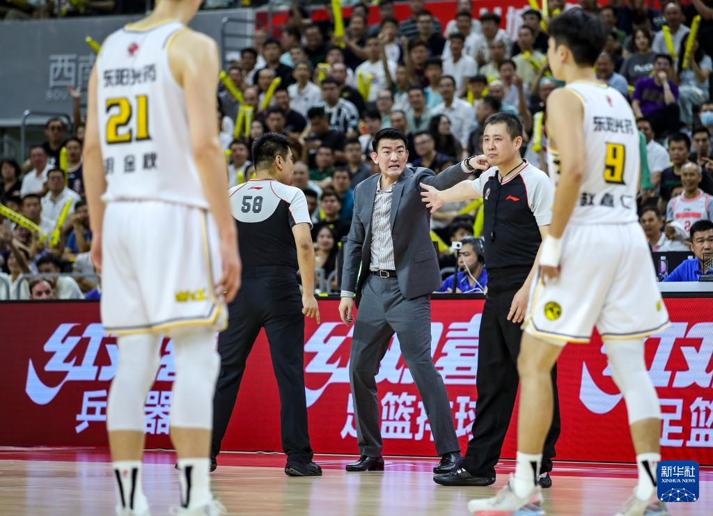 4月18日,浙江东阳光药队主教练王博(中)在比赛中。新华社发(郑家雄摄)