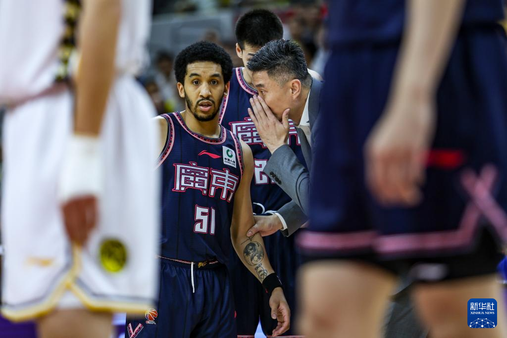 4月18日,广东华南虎队主教练杜锋(右)在比赛中指导队员沃特斯(左)。新华社发(郑家雄摄)