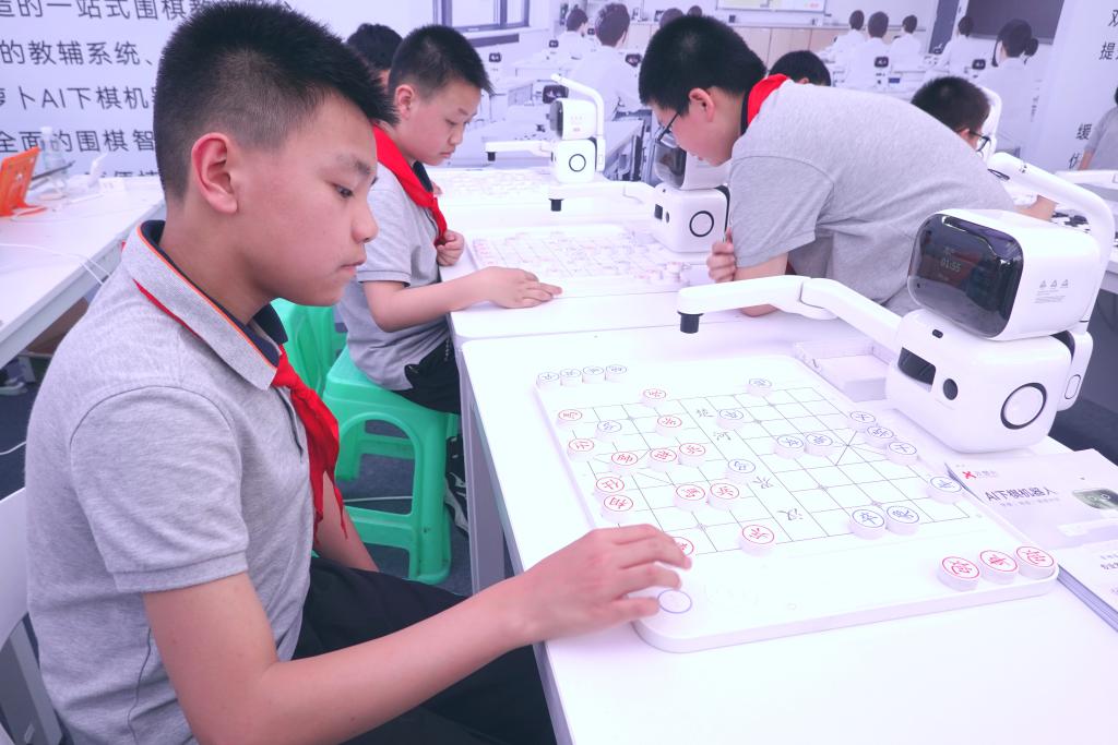 在嘉年华现场,AI围棋机器人和AI象棋机器人吸引了很多小学生与之对弈。这些机器人可以整合视觉、语言等多种模态信息,同时结合智能决策、智能控制等技术,做到“手眼协同”似真人,营造出“执子下棋”的真实体验感。参展商告诉记者,这些机器人已走进了棋校和家庭,为爱好者们练棋提供智能辅助。