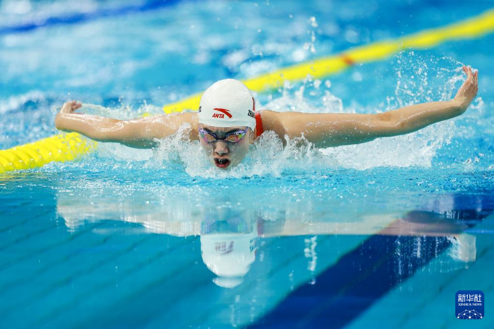 4月19日,江苏卡尔美队选手张雨霏在女子100米蝶泳半决赛中。新华社发(彭志刚摄)