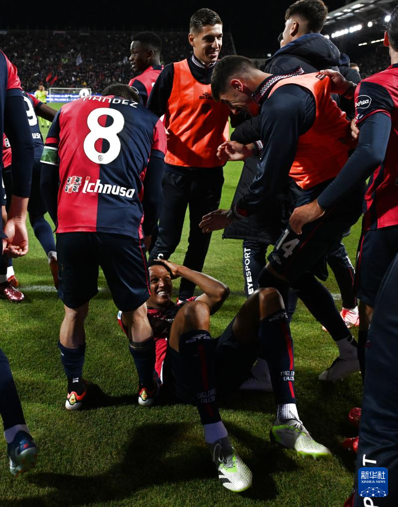 4月19日,卡利亚里队球员米纳(下)进球后与队友庆祝。新华社发(费代里科·塔尔迪托摄)