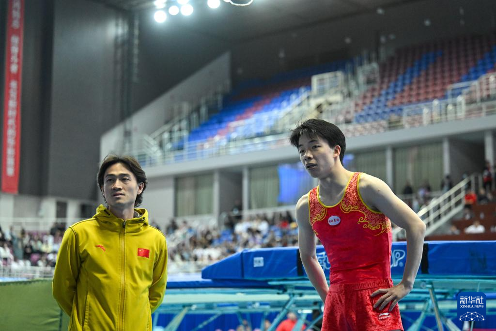 4月19日,湖南高速蹦床队选手严浪宇(右)与教练李伦在比赛结束后观看录像回放。新华社记者 孙凡越 摄