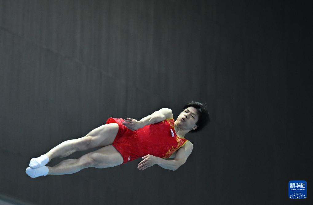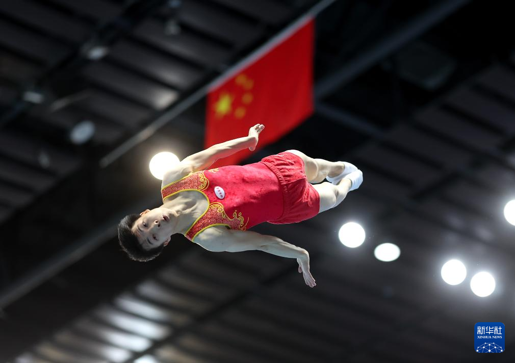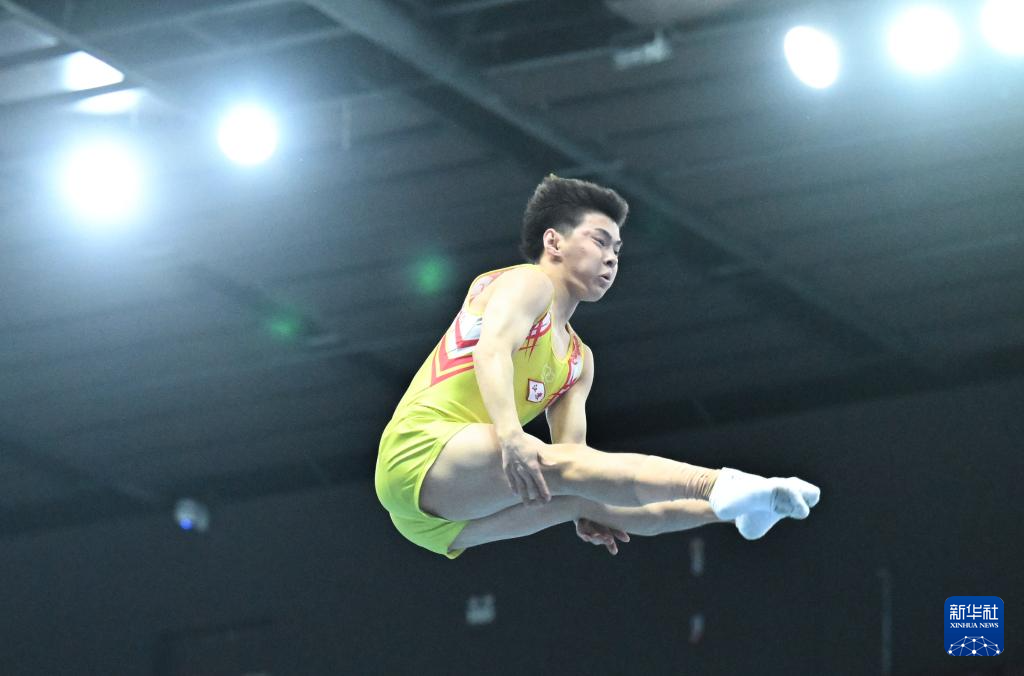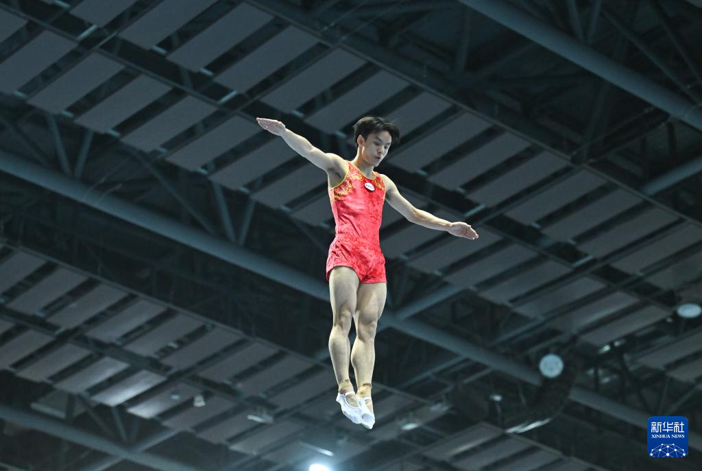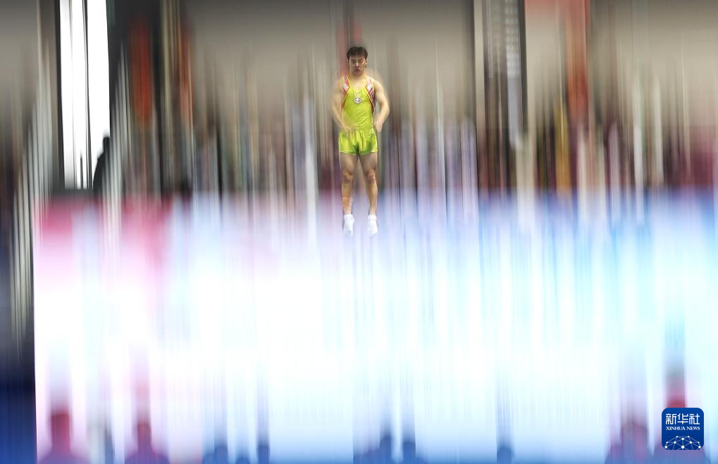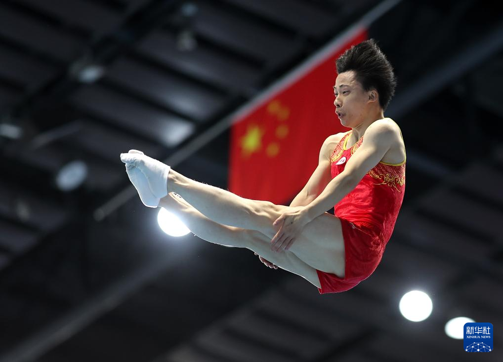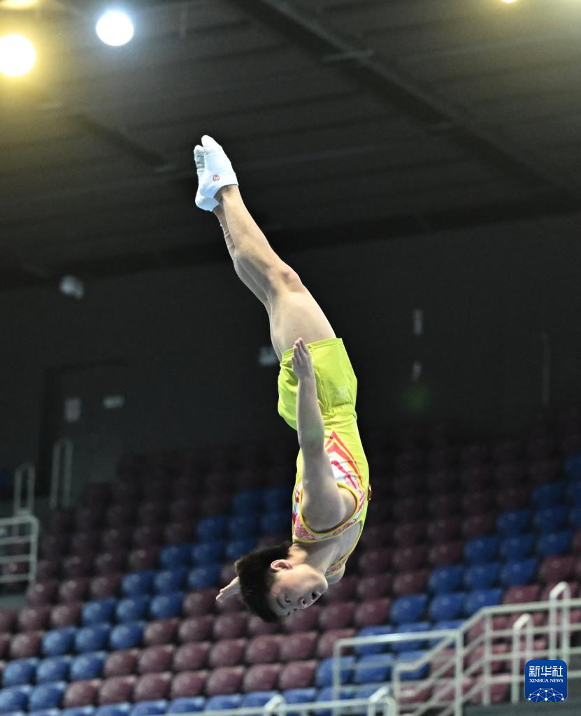 4月19日,江苏蹦床队选手王梓赛在比赛中。新华社记者 曹灿 摄