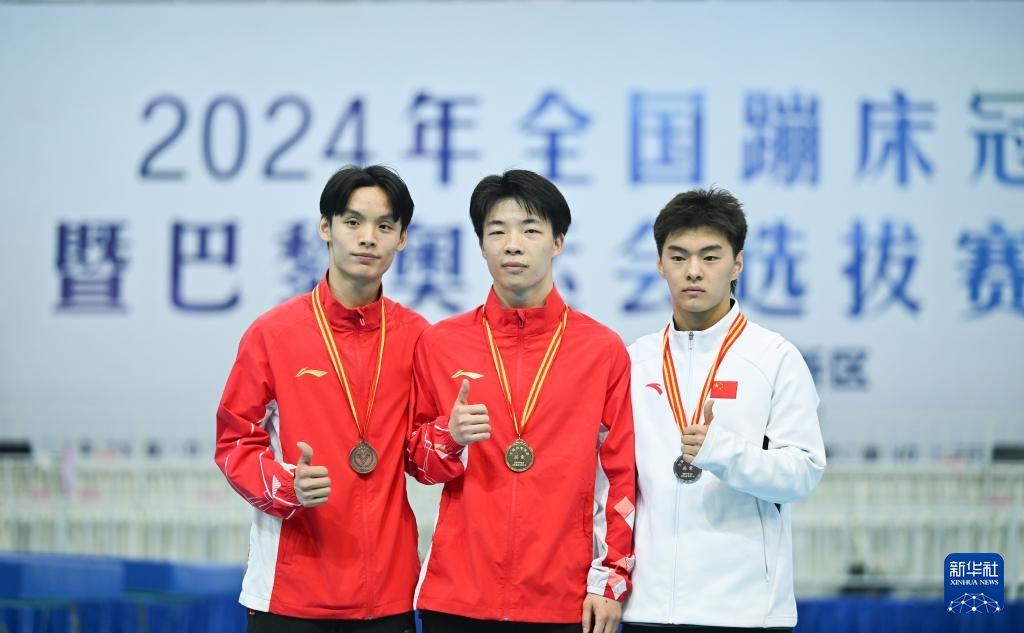 当日,2024年全国蹦床冠军赛暨巴黎奥运会选拔赛(第三站)男子网上个人决赛在天津市滨海新区举行。湖南高速蹦床队选手严浪宇以61.66分的成绩获得冠军,江苏蹦床队选手王梓赛与湖南高速蹦床队选手贺龙雨分获亚军、季军。