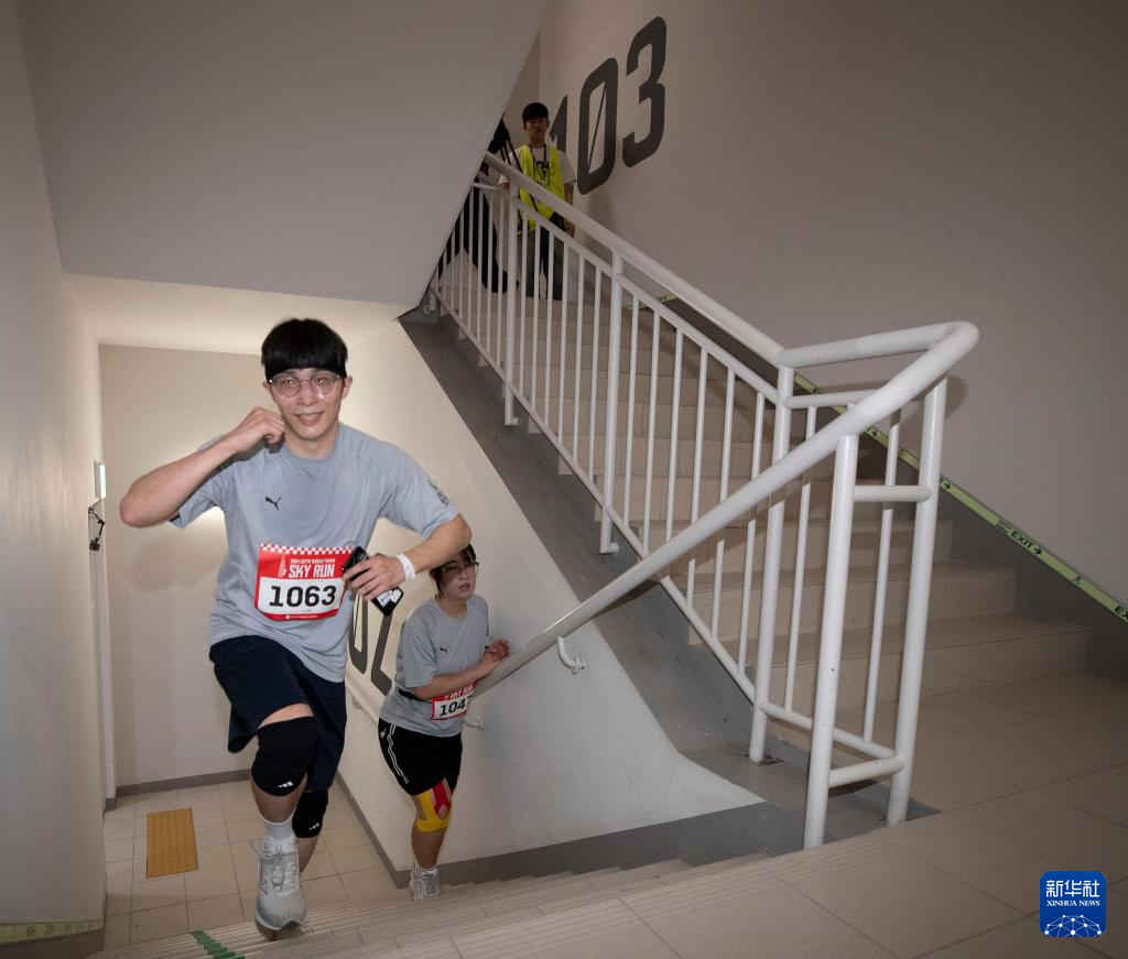 4月20日,马来西亚选手苏伟庆第一个冲过乐天世界塔123层终点。新华社记者 姚琪琳 摄