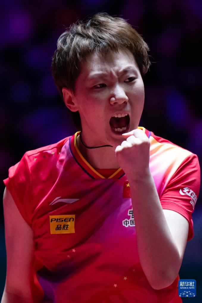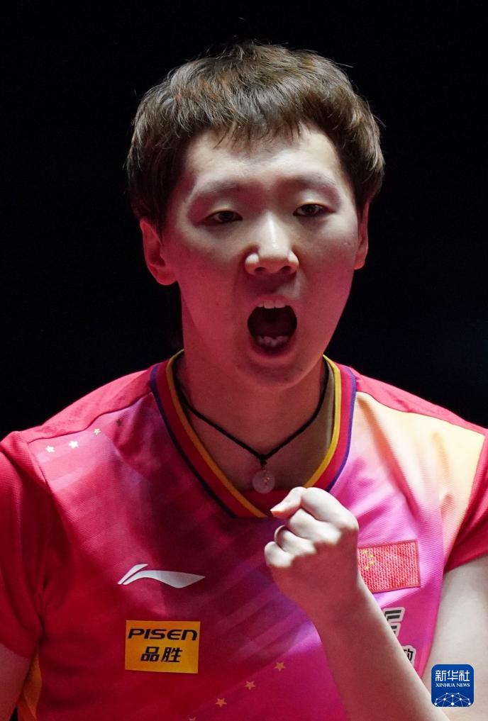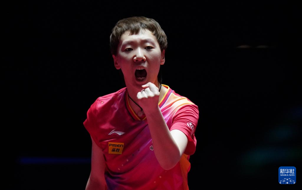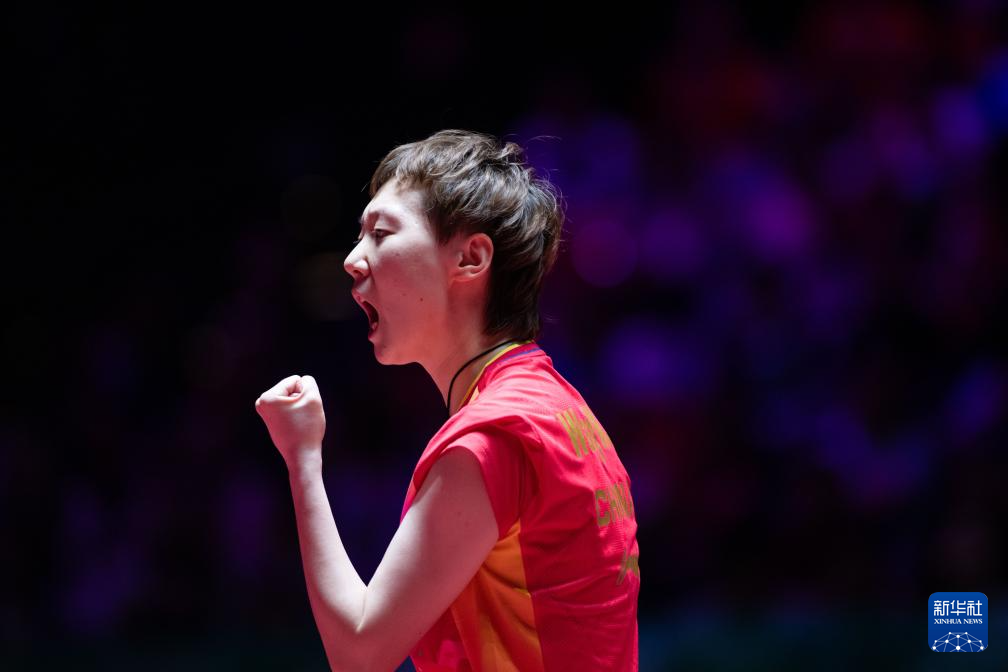 4月20日,中国选手王曼昱在比赛中庆祝得分。