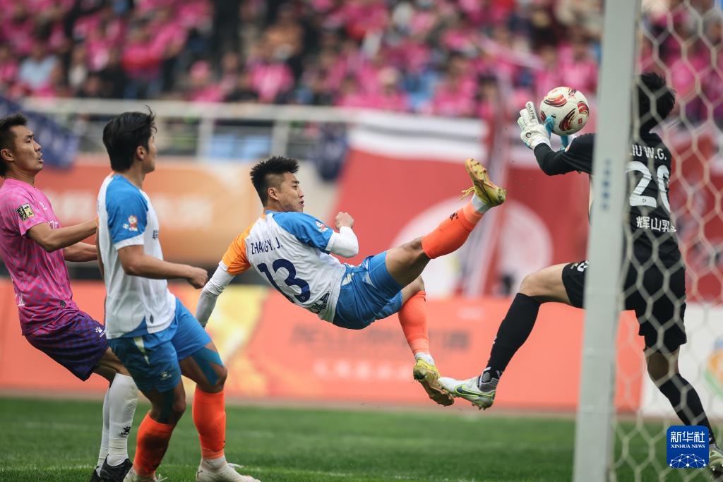 4月20日,江西庐山队球员张延军(右二)在比赛中射门。
