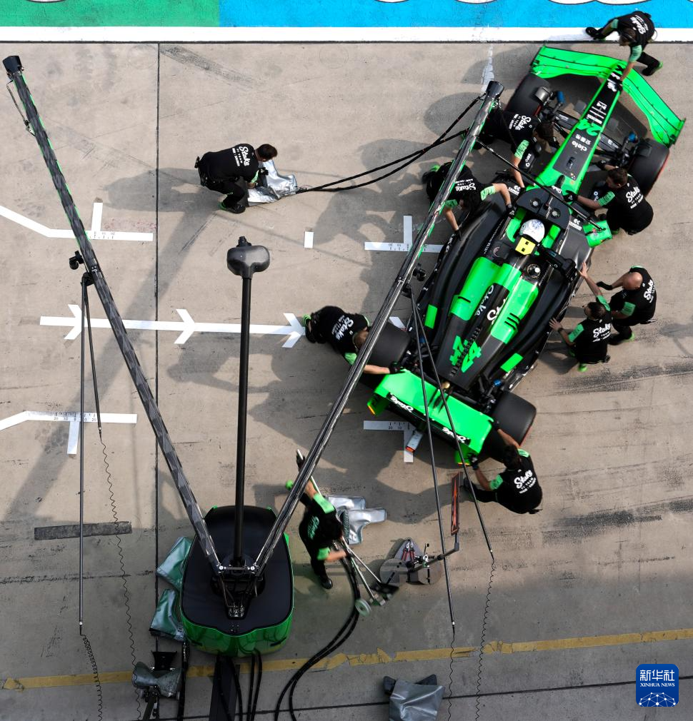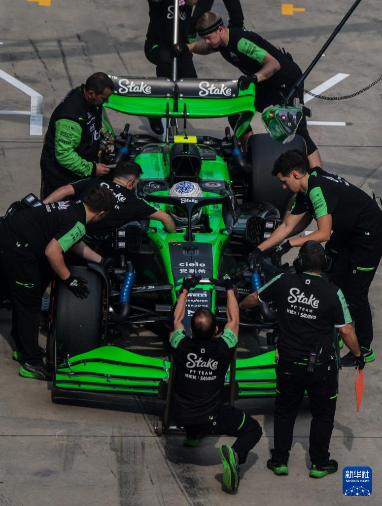 4月20日,索伯车队工作人员在维修站为车手周冠宇的赛车更换轮胎。