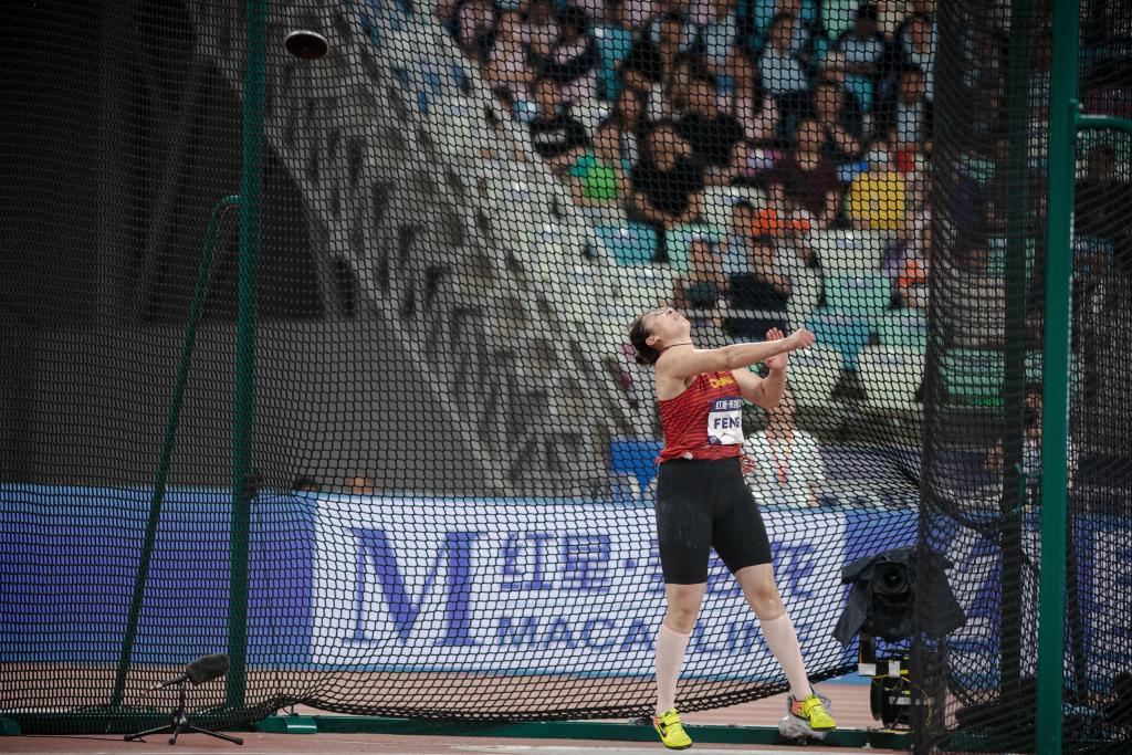 4月20日,中国选手冯彬在女子铁饼比赛中。她以67米07的成绩获得季军。新华社记者 江汉 摄